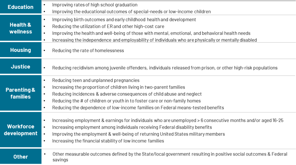 - Services must abide by an evidence-based model addressing one of 21 identified social outcomes in Figure 1